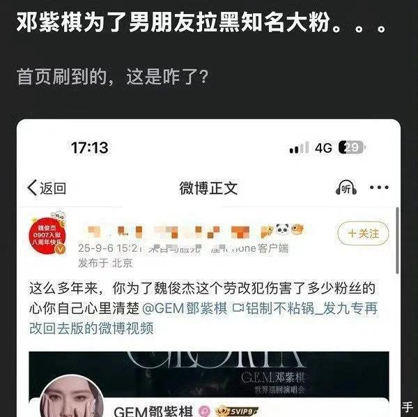 鄧紫棋知名大粉被拉黑,被拉黑大粉爆料鄧紫棋小說《啟示錄》男主原型為魏俊杰,女主原型是她自己,且專輯、巡演、小說均在影射兩人愛情故事, 就覺得鄧紫棋因為男朋友放緩或影響事業(yè)就脫粉。