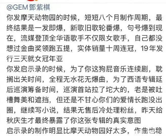這個事兒吧,說白了就是一場典型的“偶像”和“粉絲”之間關(guān)于“界限”的博弈。只能說部分粉絲太玻璃心了,喜歡鄧紫棋的歌,我覺得就是對她的最大的支持,干涉私生活就不太合適了,你總不能讓鄧紫棋做沒有七情六欲的仙子吧。