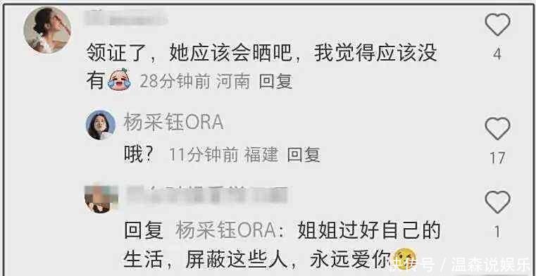 雖然這段時(shí)間一直傳言男方的爺爺不接受楊采鈺,不會(huì)讓她嫁入豪門。但是也有傳言她已經(jīng)和男友悄悄領(lǐng)證。面對(duì)網(wǎng)友在網(wǎng)上的爭(zhēng)論和猜測(cè),楊采鈺本人還在評(píng)論下回復(fù)“哦?”,回應(yīng)得很意味深長(zhǎng),似乎變相承認(rèn)已經(jīng)和男友領(lǐng)證。