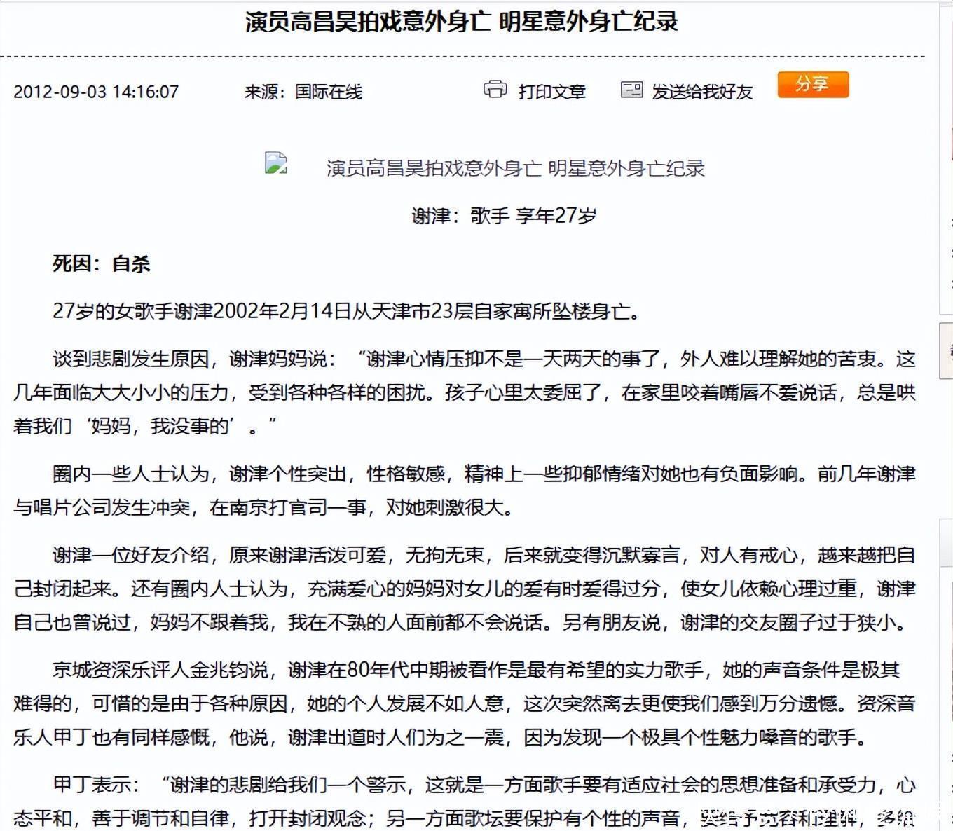 而當(dāng)這唯一的依附也無(wú)法給她提供庇護(hù)時(shí),她的世界便徹底崩塌了,她的死,是對(duì)那座名為“母愛(ài)”的牢籠最決絕的反抗,也是對(duì)那個(gè)只看重星光、卻忽視藝人心理健康的娛樂(lè)圈生態(tài)的一次血色警示。參考信息廣州日?qǐng)?bào)——自殺、他殺?女歌星謝津墜樓身亡新浪娛樂(lè)——?dú)v數(shù)明星自殺事件:離開(kāi)是種解脫?國(guó)際在線(xiàn)——演員高昌昊拍戲意外身亡 明星意外身亡紀(jì)錄