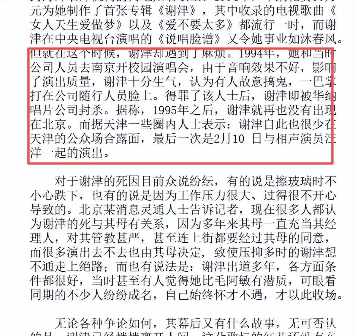 謝津放棄了掙扎,為了不讓母親失望,她假意順從,答應(yīng)會(huì)好好活下去,但內(nèi)心的折磨,只有她自己知道,1999年2月10日,她與相聲演員汪洋的演出,成了她人生中最后一次公開(kāi)亮相。四天后,也就是2月14日,她在家中平靜地洗了個(gè)澡,然后掙脫了母親用鐵絲布下的“牢籠”,從23樓的窗戶(hù)縱身躍下,目擊者說(shuō),她最后喊了一聲“媽媽”。結(jié)語(yǔ)謝津的死,在當(dāng)時(shí)引發(fā)了各種猜測(cè),不慎跌落、他殺,甚至有人將矛頭直指她的母親,直到處理完女兒的后事,這位悲痛的母親才向外界透露,女兒其實(shí)長(zhǎng)期心情壓抑,但她一直以為那只是事業(yè)不順的正常情緒,從未真正重視過(guò)。