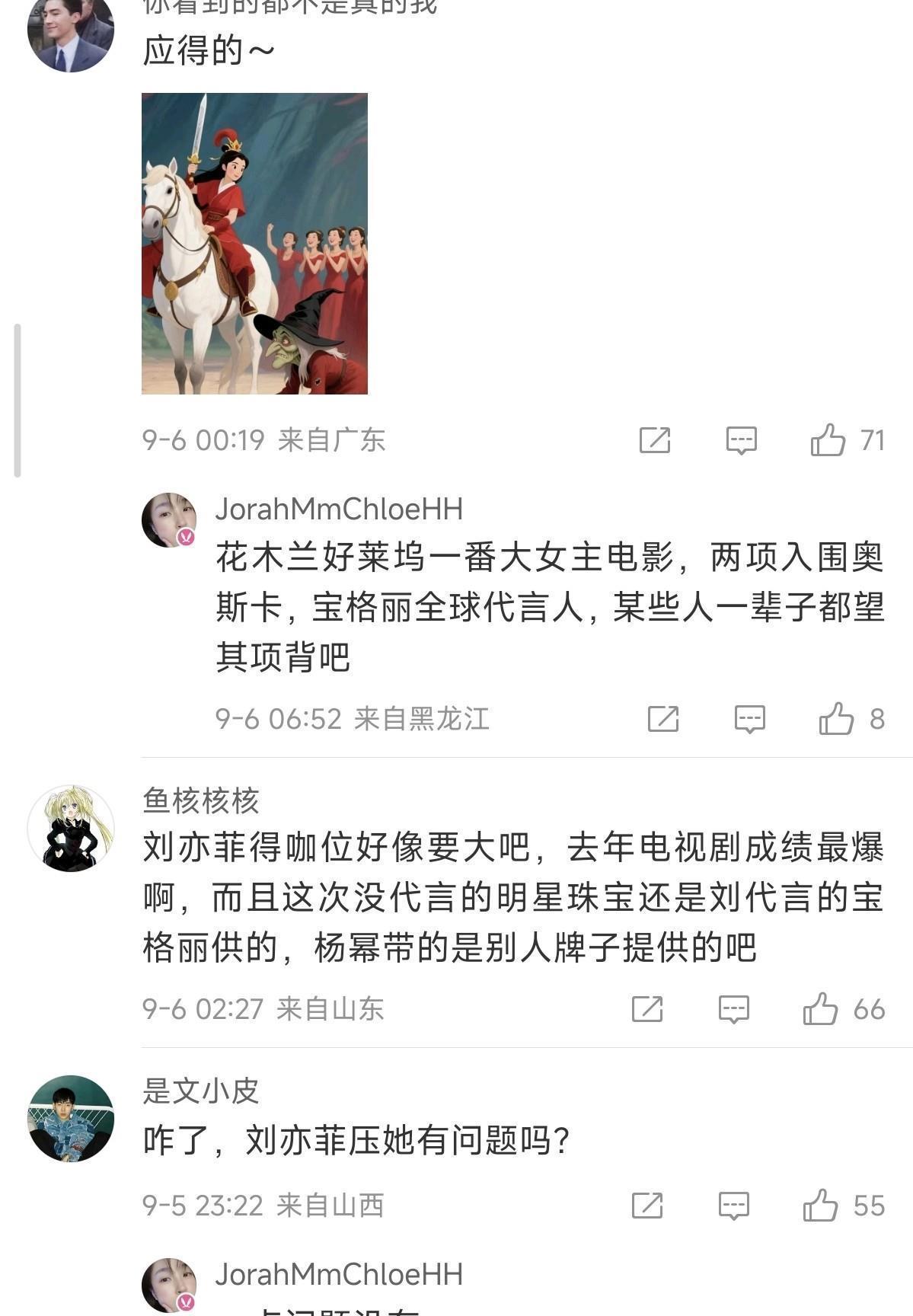 而且劉亦菲的花木蘭兩次入圍奧斯卡還是寶格麗的全球代言人這個(gè)資源和榮譽(yù)并不低??灰膊⒉槐葪顑缧?。