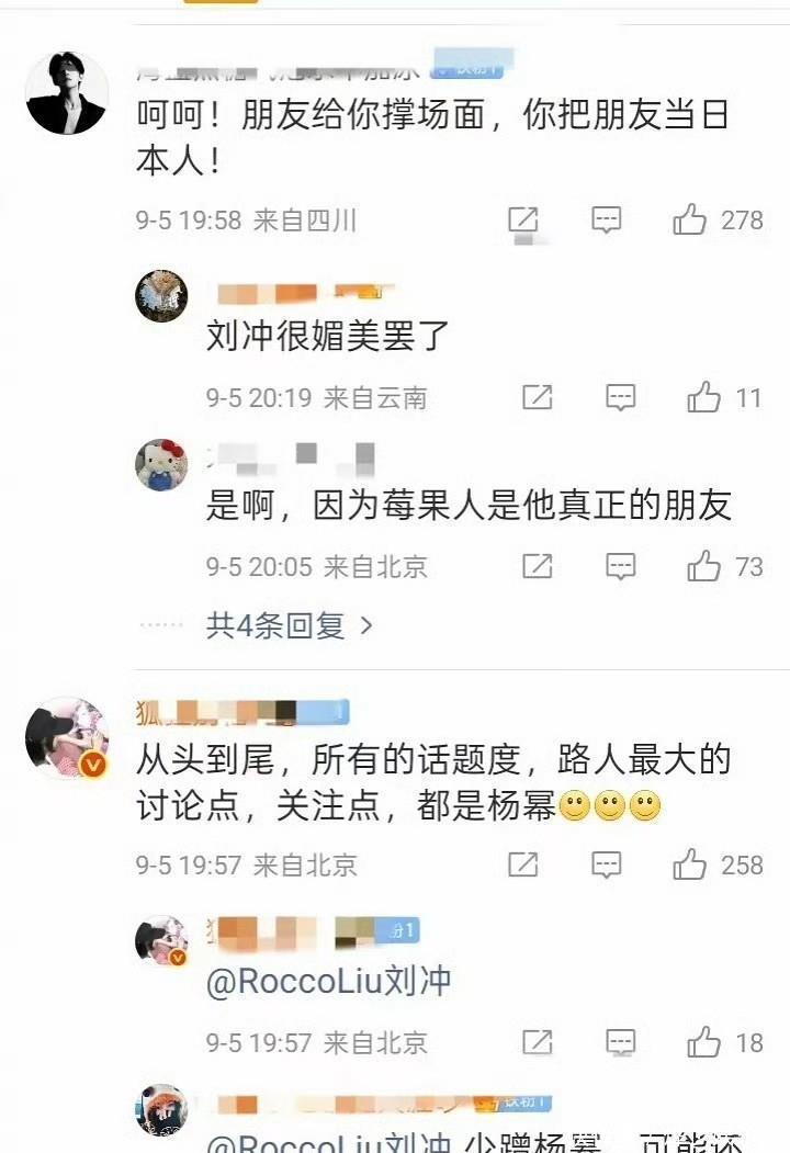 網(wǎng)友說(shuō):真招笑,意思是劉沖和楊冪是朋友就可以得到最高待遇,那可真不是一般的朋友啊。