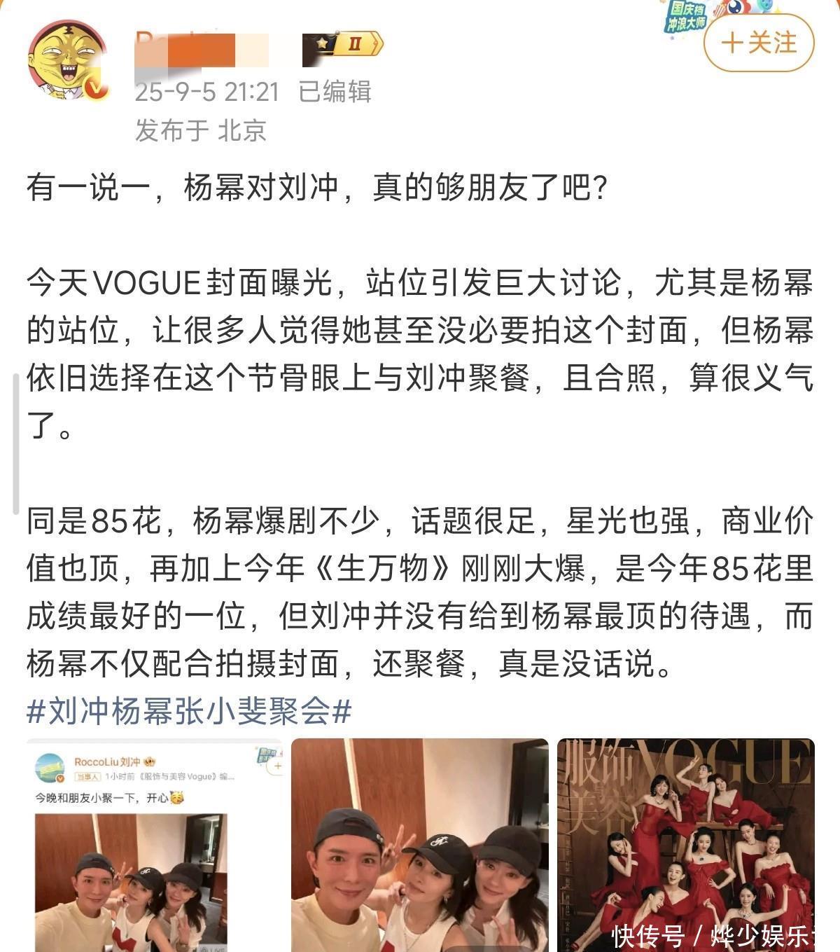 而且這個(gè)站位也引發(fā)了巨大的爭(zhēng)議。楊冪粉絲開噴劉沖很多人覺(jué)得楊冪既然不是c位,那就沒(méi)有必要來(lái)拍這個(gè)了。而且在拍完這個(gè)之后,楊冪還是跟這個(gè)劉聰一起吃飯合照,他們覺(jué)得這算很義氣了。