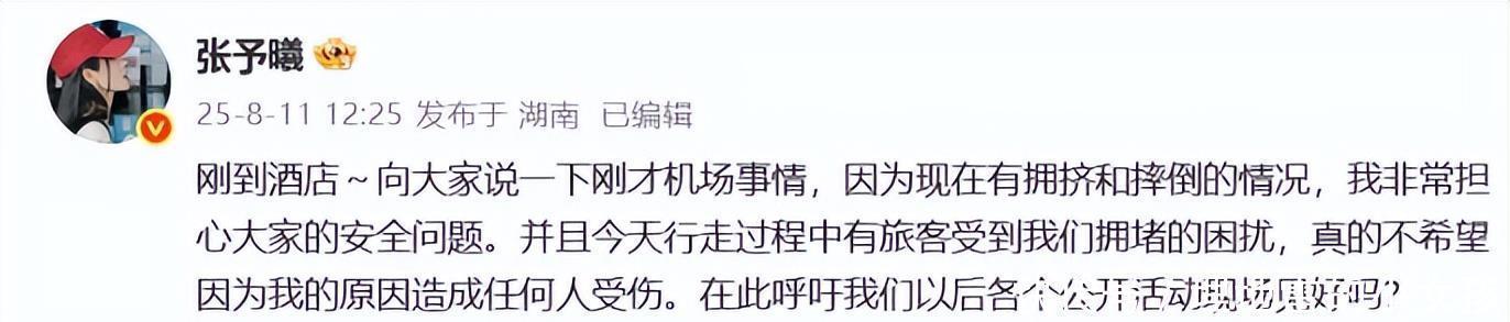 8月份,張予曦就曾在機(jī)場遭遇粉絲圍堵,現(xiàn)場發(fā)生摔倒的畫面在網(wǎng)上曝光,8月11日,張予曦發(fā)文回應(yīng)機(jī)場遭圍堵事件:“剛到酒店~向大家說一下剛才機(jī)場事情,因?yàn)楝F(xiàn)在有擁擠和摔倒的情況,我非常擔(dān)心大家的安全問題。并且今天行走過程中有旅客受到我們擁堵的困擾,真的不希望因?yàn)槲业脑蛟斐扇魏稳耸軅T诖撕粲跷覀円院蟾鱾€(gè)公開活動(dòng)現(xiàn)場見好嗎?”