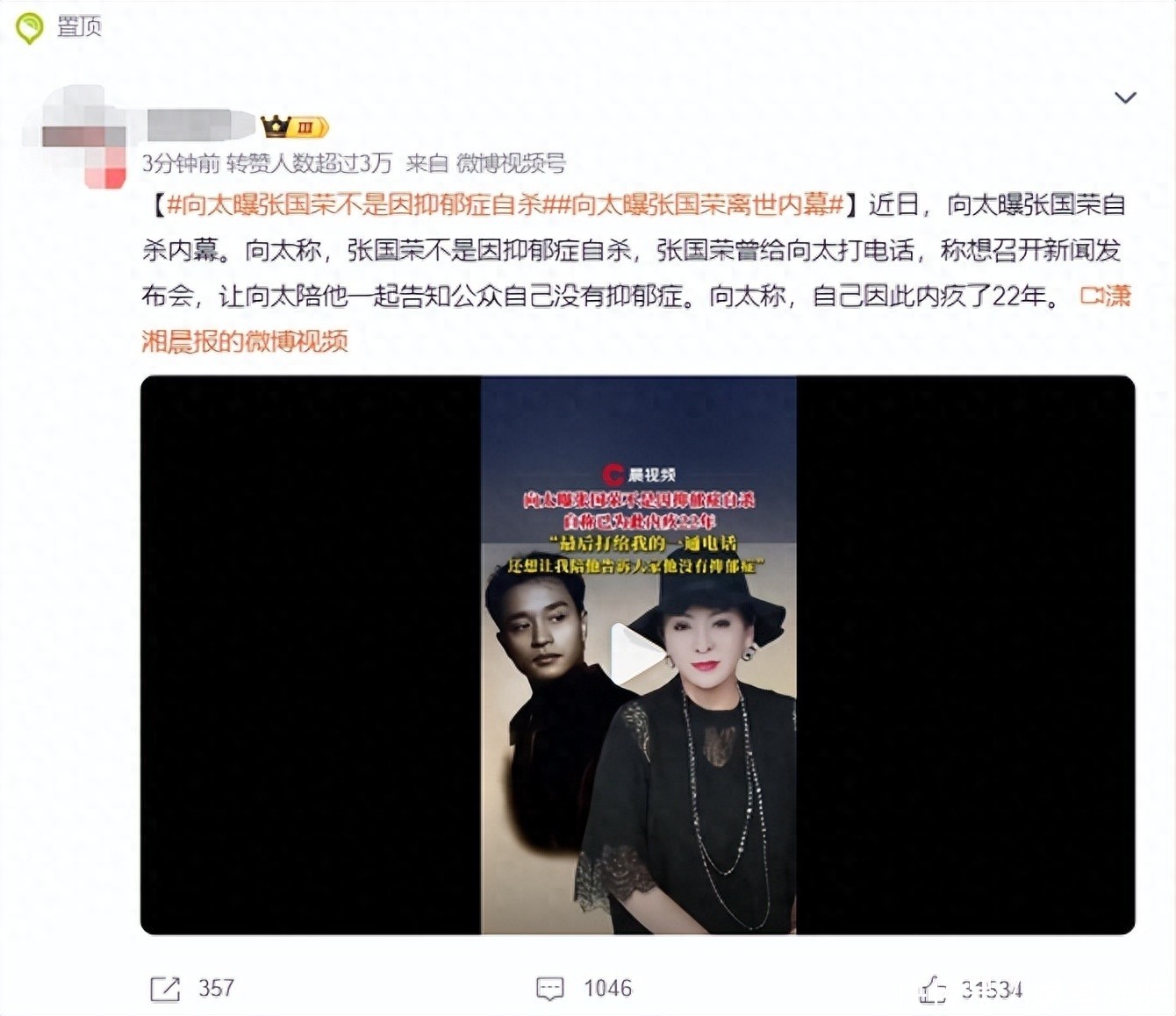 张国荣离世至今已过年,世人普遍认为他因抑郁症而选择轻生,不曾想,近日向太陈岚却透露出张国荣去世另有隐情。
