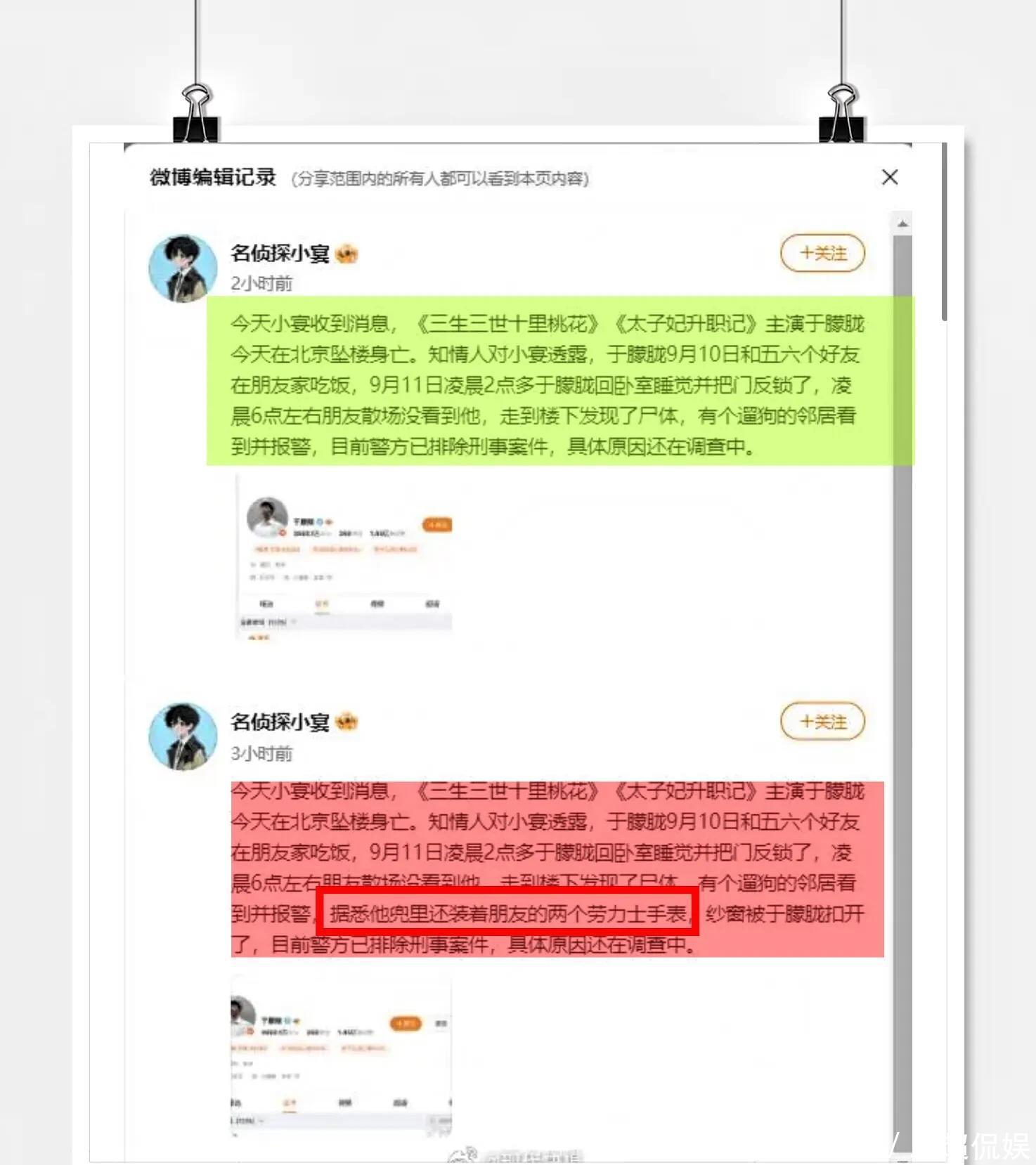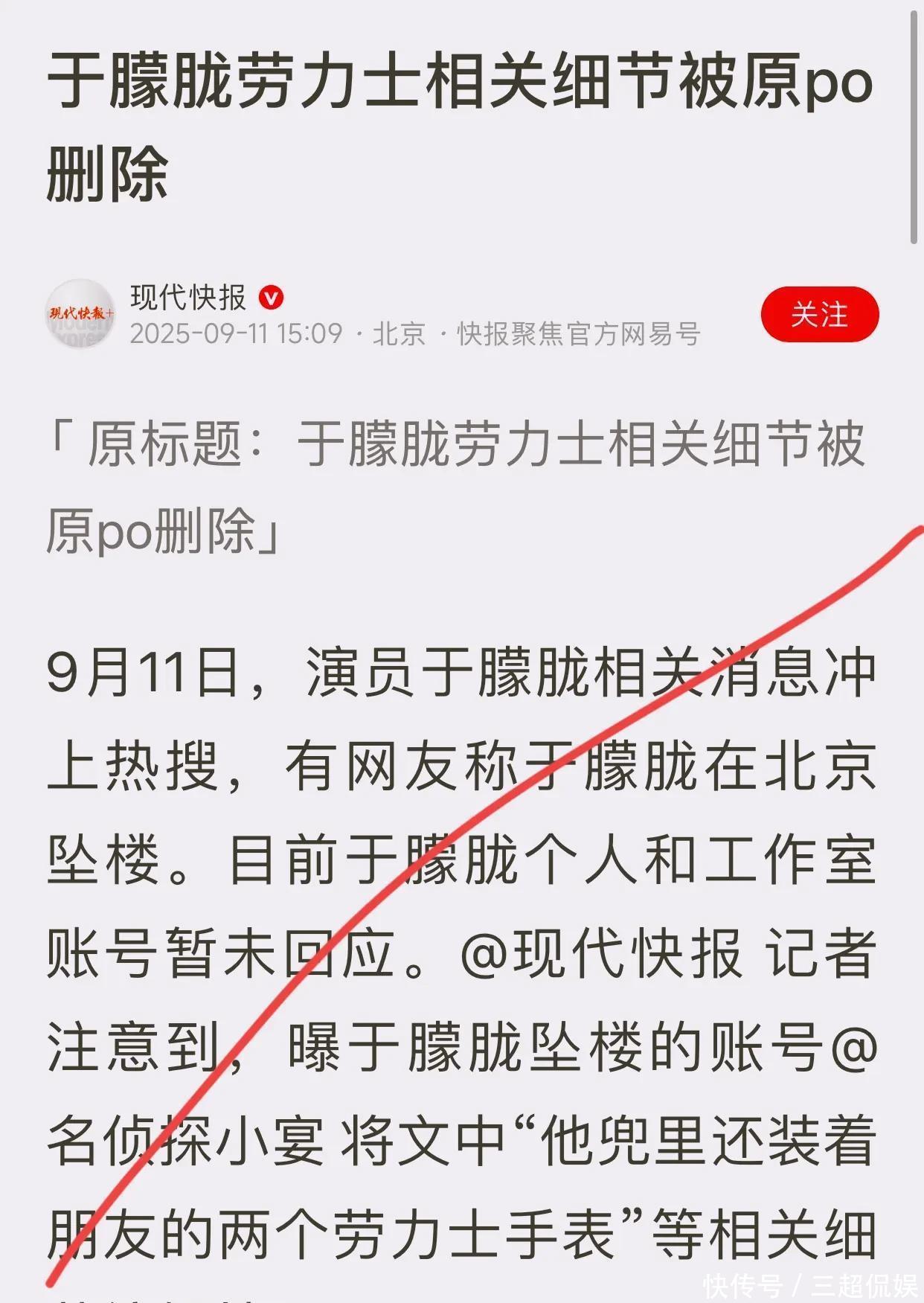 剛剛媒體報(bào)道,最開(kāi)始爆料于朦朧跳樓的狗仔刪除了于朦朧口袋里有兩塊勞力士手表的文字,沒(méi)過(guò)多久,有網(wǎng)友發(fā)現(xiàn)他把整個(gè)文章都刪除了!