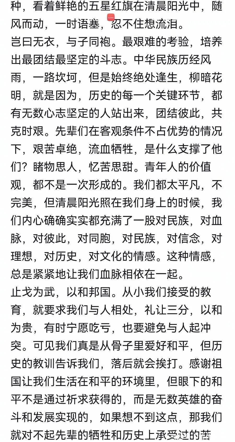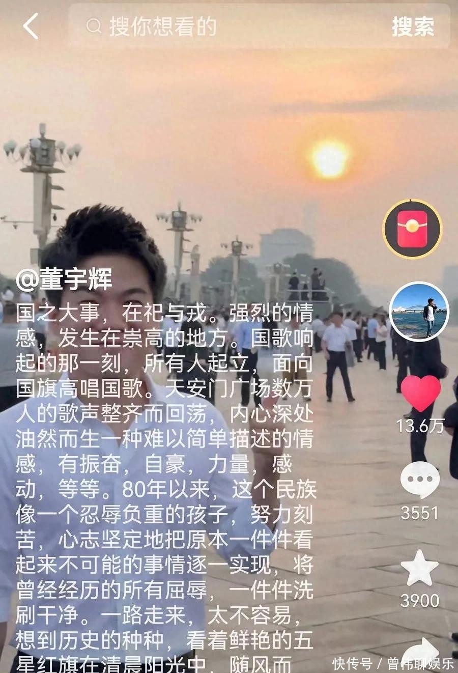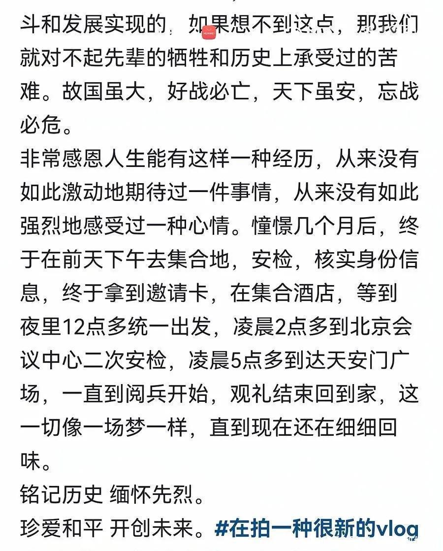 董宇辉在连续发布了七条他在观礼现场录的视频之后,又在自己的个人账号上面更新了一则,自己参加这次观礼的全过程,并且还有一篇长文诉说了自己的观后感。在董宇辉的长文中,这次并没有延续以往的风格,反而使用了一种简单的记叙手法,文字虽然浅显易懂,可是却让整篇文章都充满了气势磅礴与爱国之情的交融。可以说,这是一种抒发情感的绝佳方式,比语言的华丽,看上去更加能让人感觉到心灵的震撼。再加上董余辉在视频中的演绎 ,更加让人觉得他参加这次活动给自己带来的震撼与思考。