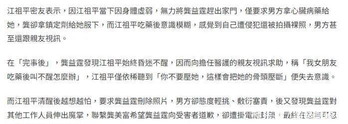 那晚江祖平身體不適,讓龔益霆幫忙拿心臟病藥,他卻遞來鎮(zhèn)定劑。她昏迷后遭侵犯,整個(gè)過程還被拍攝下來。事后男方發(fā)現(xiàn)她狀況不對,才聯(lián)系醫(yī)院朋友求助,險(xiǎn)些造成更嚴(yán)重的后果。