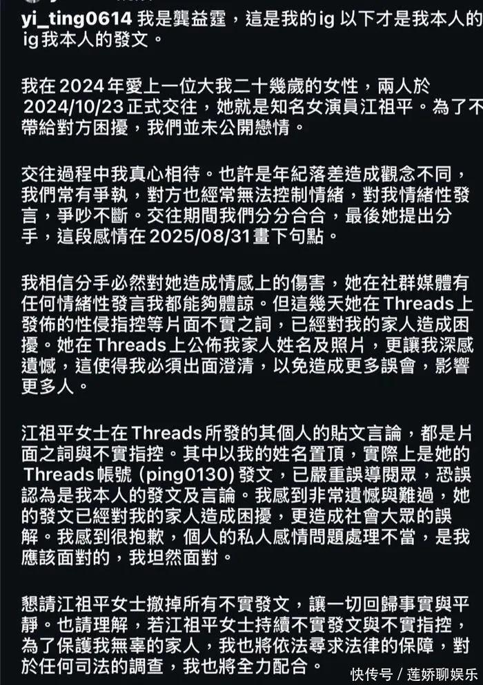 龔益霆聲稱兩人是正常情侶關(guān)系,否認(rèn)性侵指控。但江祖平反駁說,上周兩人才正式分手,交往的八個(gè)月里,男方經(jīng)常罵臟話甚至砸壞她的房門,這顯然不是情侶間應(yīng)有的尊重。