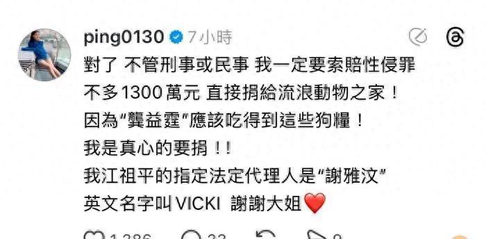 近日,臺灣女星江祖平對25歲的龔益霆提出性侵指控,并索賠1300萬臺幣,表示勝訴后將全部捐給流浪動(dòng)物機(jī)構(gòu)。男方否認(rèn)指控,稱兩人曾是情侶關(guān)系,對方是因分手情緒失控而編造謊言。警方已介入調(diào)查,士林地檢署已指揮分局偵辦此案。