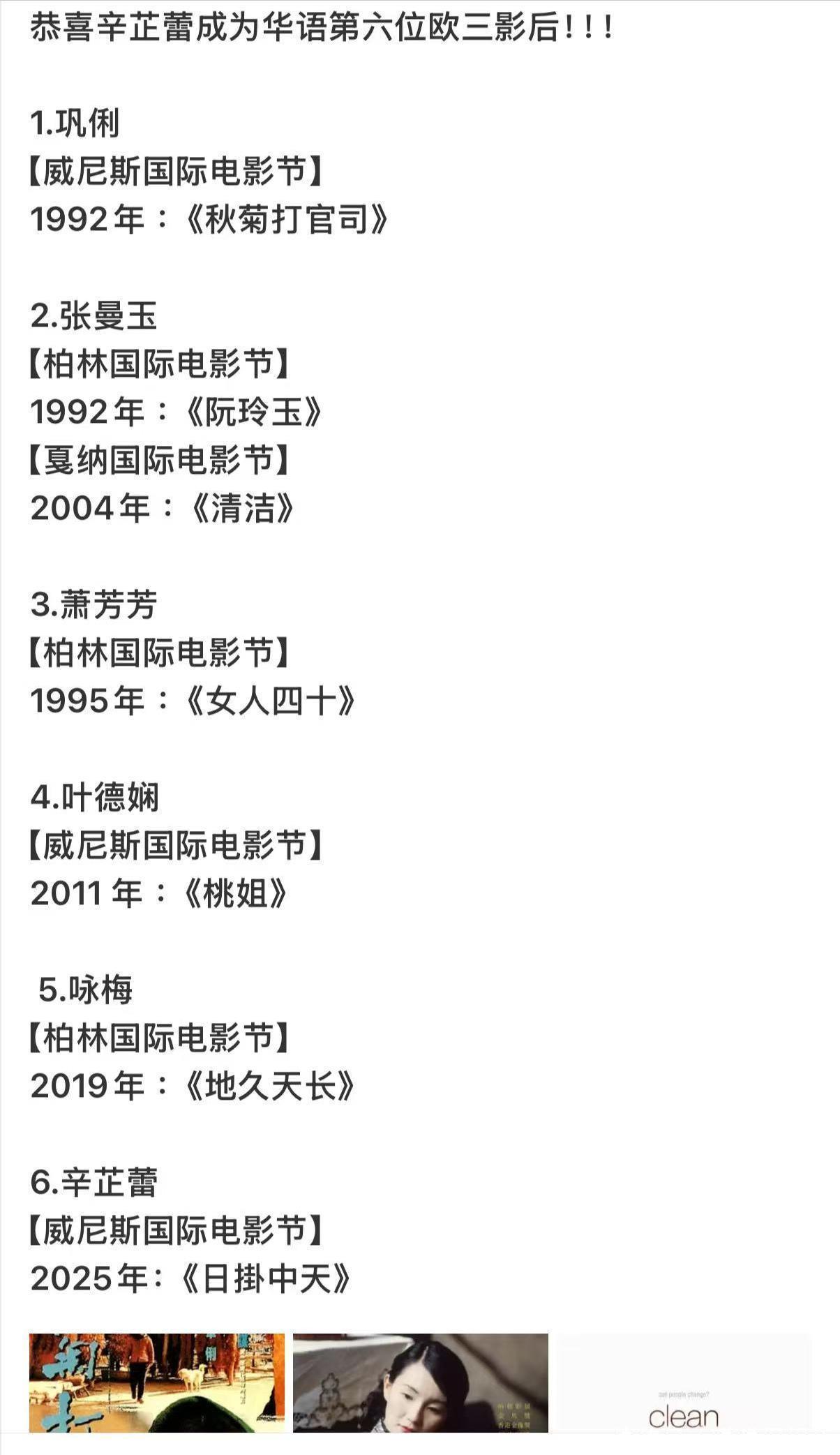 辛芷蕾是繼鞏俐第二位獲得此項(xiàng)榮譽(yù)的中國(guó)女演員。而鞏俐獲得也是在1992年了,距離今年已經(jīng)過(guò)了33年的時(shí)間。這也是為何網(wǎng)友會(huì)如此激動(dòng)的原因。