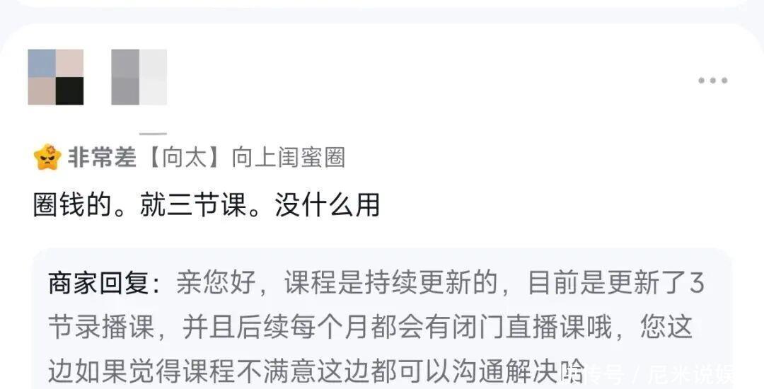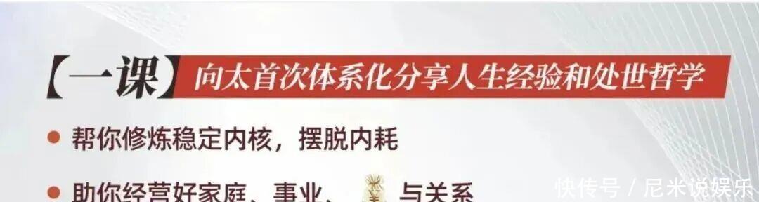 這堂號(hào)稱能帶粉絲“鏈接高質(zhì)量圈層”的課程,目前只更新了3節(jié)錄播課,而且客服連具體有多少節(jié)課、什么時(shí)候直播都不確定,但這并不妨礙向太賺錢,截至8月31日,這個(gè)課程在多個(gè)平臺(tái)累計(jì)銷售額近200萬元。向太作為已經(jīng)身家過億的豪門闊太,為什么還要來賺普通人的這幾百塊錢?答案很簡單:因?yàn)檫@錢實(shí)在太好賺了!一次錄制,永久收錢,不用建供應(yīng)鏈、不用管售后,靠著人設(shè)和故事,一張嘴就能把粉絲的錢變成自己的。在明星直播帶貨普遍遇冷的當(dāng)下,向太并不是第一個(gè)“知識(shí)導(dǎo)師”,像伊能靜的《高能量女性成長課》、王晶的《王晶大師課:人生由我掌控》...從帶貨主播到知識(shí)導(dǎo)師,明星們仿佛找到了新的“財(cái)富密碼”。1./ 從9.9包郵到399的閨蜜圈,向太升級(jí)成"知識(shí)導(dǎo)師"?/向太陳嵐的直播帶貨生涯堪稱一部"向上"進(jìn)化史。從一開始的平價(jià)好物到售賣奢侈品,如今她找到了新的生財(cái)之道:知識(shí)付費(fèi)課程《向太向上閨蜜圈》。支撐起這門課程的是她多年精心經(jīng)營的豪門人設(shè):娛樂圈大姐大、豪門闊太、疼兒媳的婆婆。這些標(biāo)簽,直接成了課程最硬核的賣點(diǎn)。這門課程標(biāo)價(jià)599元,還有個(gè)減200的券,用券后是399元,主要由"一套課"和"一張卡"組成。課程聲稱能幫助購買者"穩(wěn)定內(nèi)核、擺脫內(nèi)耗",并助其"經(jīng)營好家庭、事業(yè)、財(cái)富與關(guān)系"。