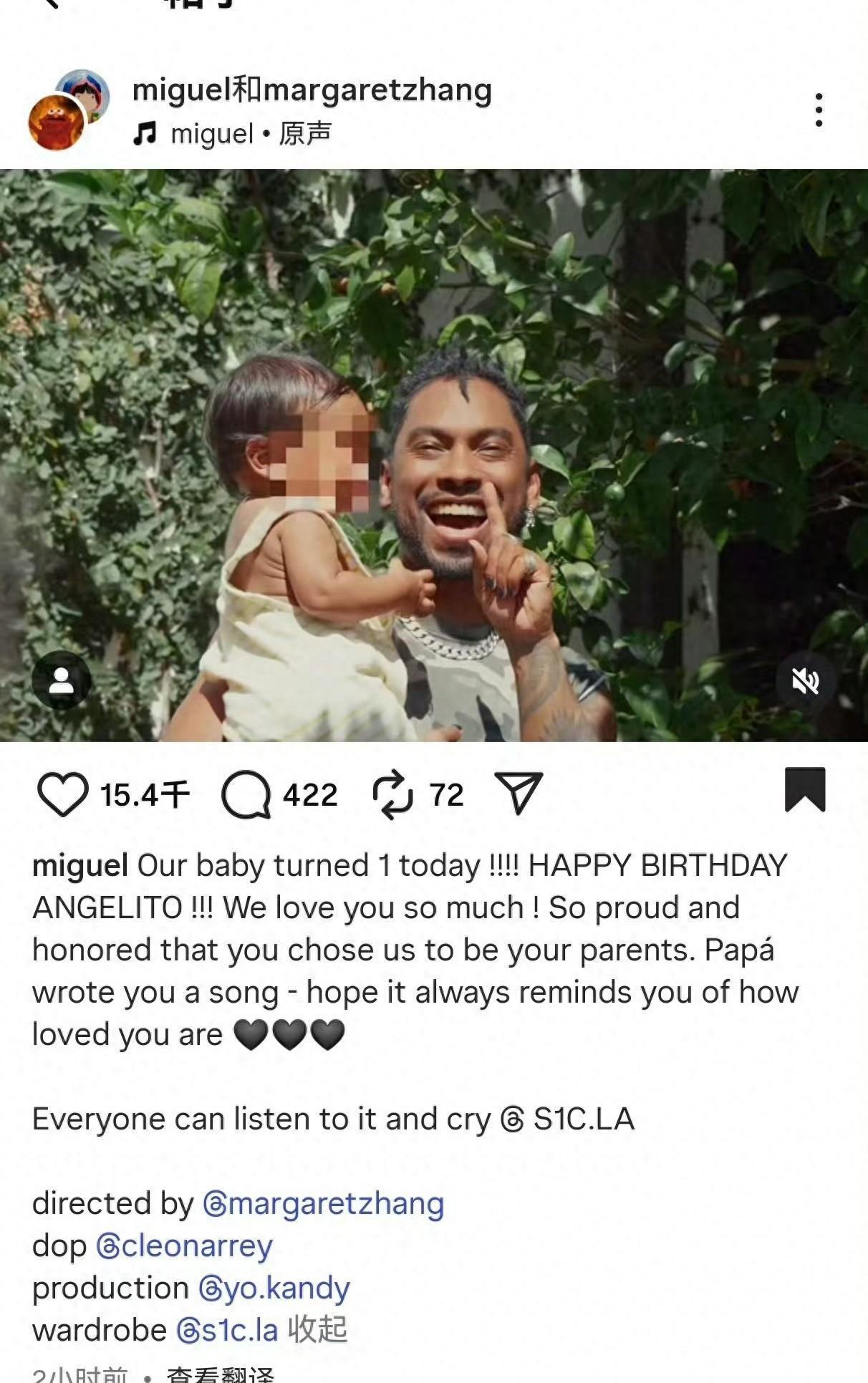 9日,澳籍华人章凝Margaret Zhang在儿子Angelito一周岁生日的当天,通过ins首次公开孩子父亲为美国R B歌手米格尔.皮蒙特尔Miguel,双方同步发布亲子照及配文:"我们的宝贝今天岁了!生日快乐 Angelito!我们非常爱你!感到骄傲和荣幸,你选择了我们成为你的父母。"
