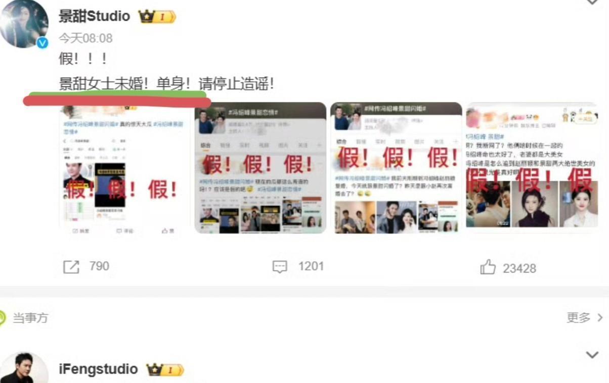 这场绯闻的源头,与冯绍峰和景甜共同主演的古装剧《灼灼风流》有关。有剧组相关人士爆料,两人在拍摄过程中因戏生情,跳过恋爱阶段直接领证结婚,甚至明确给出 “8 月 29 日登记” 的具体日期。该消息一出,迅速在网络上扩散。剧中,冯绍峰饰演的沙场将军与景甜扮演的女官有大量对手戏,两人在剧中的情感互动自然细腻,不少观众本就对这对荧幕 CP 抱有好感。现实中,两人外形气质也颇为契合,冯绍峰过往公开的恋情中,伴侣多为赵丽颖这类气质型女性,而景甜温婉大气的形象确实与其偏好相符,这让部分网友对绯闻半信半疑。面对愈演愈烈的传闻,景甜工作室在 9 月 4 日中午做出回应。工作室发布九宫格声明,每一张图片中央都用醒目的红色字体印着一个 “假” 字,视觉冲击力极强。声明正文明确表示 “景甜目前未婚,所谓闪婚传闻纯属不实信息”,同时附上 8 月底景甜在直播中与粉丝互动的截图,当时她还在与网友讨论工作安排,完全没有即将结婚的迹象。这份回应态度坚决,逻辑清晰,很快获得大量网友认可。