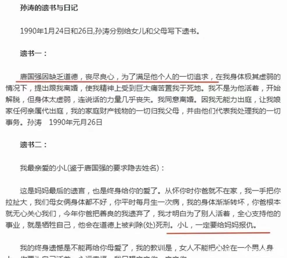 然而他的心太硬了,他鐵了心要辦完這個(gè)手續(xù),跑到他的娘家脅迫她簽字,還揚(yáng)言威脅,在這種情況下孫濤的精神徹底崩潰。90年的除夕夜,這個(gè)本該張燈結(jié)彩的團(tuán)圓日,成為了孫濤生命的最后一天,她在娘家結(jié)束了自己的生命,還留下了一封遺書。