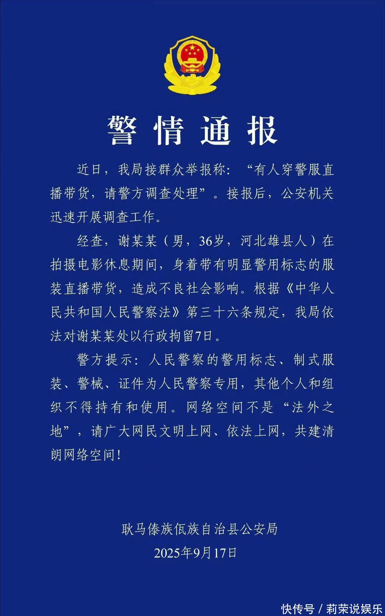 9月17日晚,云南省臨滄市耿馬傣族佤族自治縣公安局發(fā)布了一則警情通報(bào)。原來,是“嘎子哥”謝孟偉出了事。經(jīng)查,謝孟偉在拍攝電影休息期間,身著帶有明顯警用標(biāo)志的服裝直播帶貨,造成了不良社會(huì)影響。據(jù)了解,9月10日,謝孟偉在云南拍戲間隙開啟直播,向粉絲推銷充電寶與隨身WiFi時(shí)穿著帶有肩章、臂章的警服。遼寧觀眾李先生發(fā)現(xiàn)后直接向警方舉報(bào)。