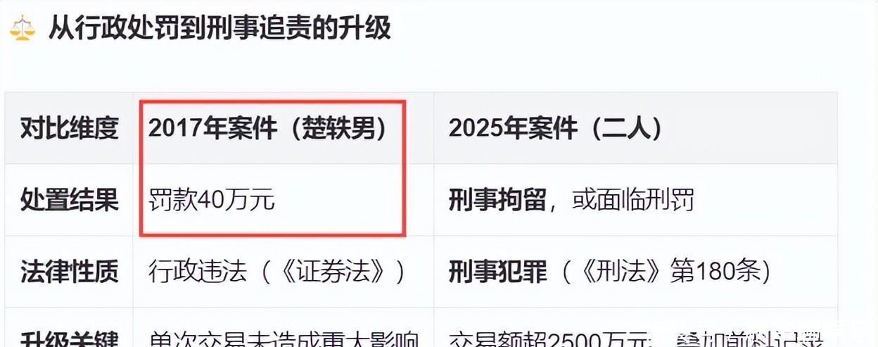 事后,楚軼男被罰了40萬元。但更加沒想到的是,八年后出現(xiàn)了重大轉(zhuǎn)折。隨著監(jiān)管技術(shù)的不斷升級,鄭躍文與楚軼男的違法行徑徹底暴露,且存在“前科記錄”。如今,兩人因交易金額遠(yuǎn)超內(nèi)幕交易刑事立案標(biāo)準(zhǔn),被正式刑事拘留,案件也移送檢察機(jī)關(guān)審查起訴。