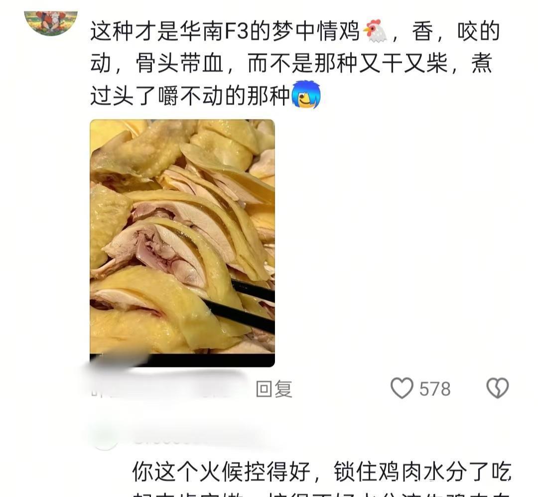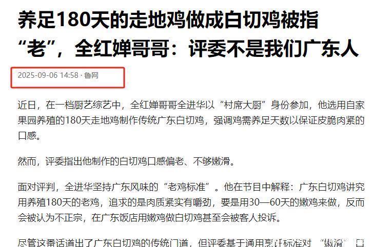 有从事粤菜行年的大厨在评论区留言。180天的土鸡确实适合做白切鸡,但浸鸡的水温要控制℃左右,分钟关火分钟,他视频里水开后直接煮,肉肯定老。不仅如此,还有网友翻出了当地号称粤菜教科书饭店的白切鸡制作标准。发现这里的厨师对浸鸡时间、水温的把控精确到分钟,而全进华的操作明显粗糙。