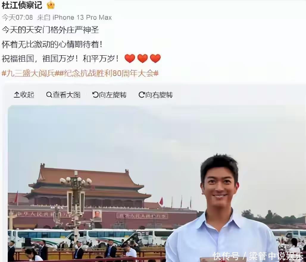 甚至還忍不住的拍了照片,以及他的邀請函,看來這次他也是受邀參加的啊。那張嘉賓證就是最好的證明,杜江也表示這是他要珍藏一生的嘉賓證。激動的他在社交媒體上,呼喊著“祖國萬歲,和平萬歲”。