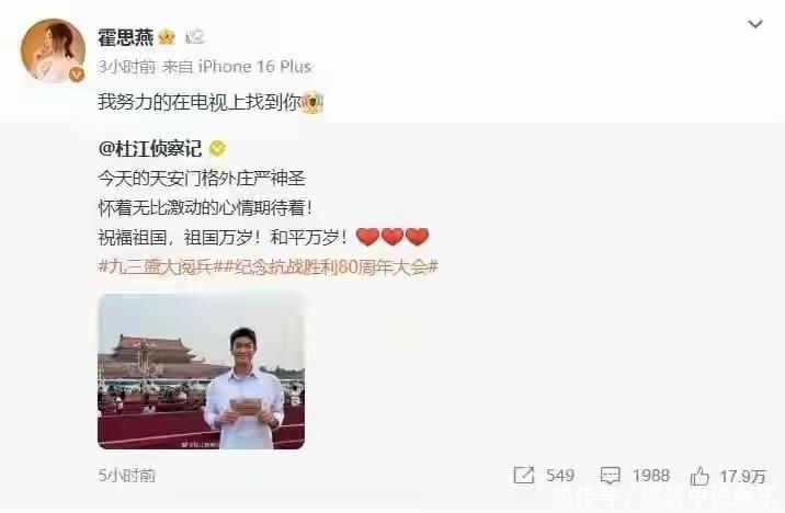 還專門發(fā)文表示“我努力的在電視上找到你”。能在閱兵中有鏡頭,也算是很榮耀的一刻了。看到杜江這般開心,網(wǎng)友們也替他感到開心,終于圓夢,表示對方真是根正苗紅啊。