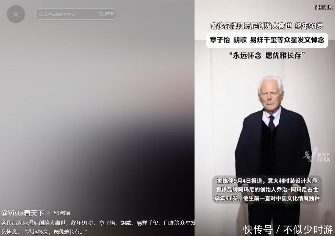 参考信源:Vista看天下——《奢侈品牌阿玛尼创始人离世,终岁。章子怡、胡歌、易烊千玺、白鹿等众星发文悼念:“永远怀念,愿优雅长存?!薄?025-09-05