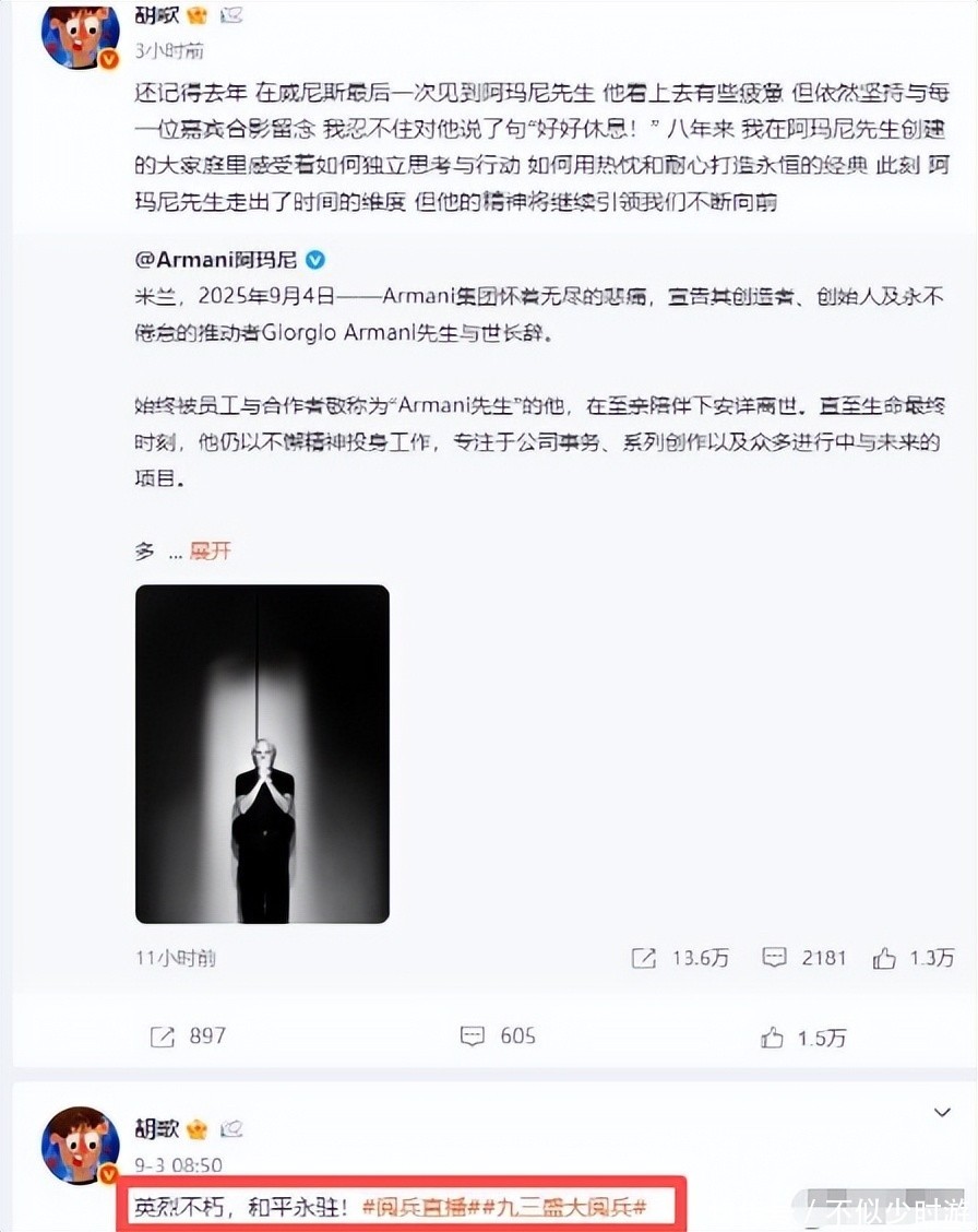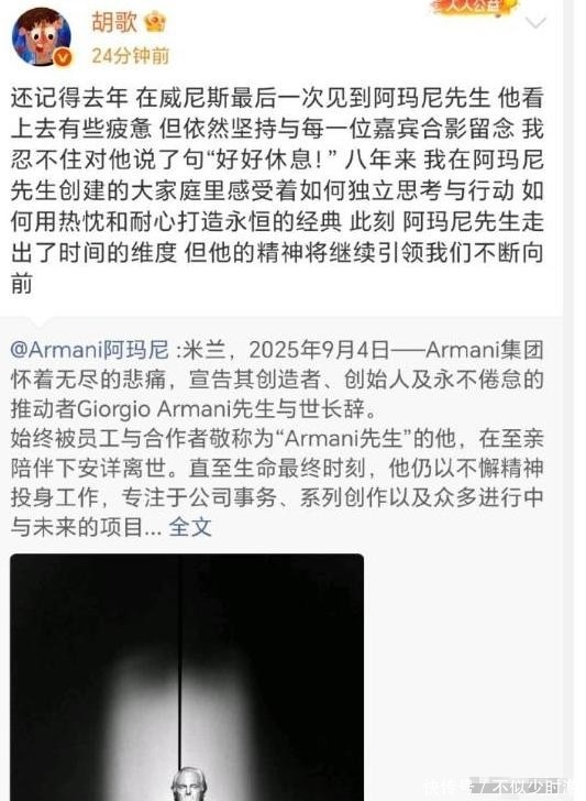 国+社区——《时装设计师乔治·阿玛尼离世,胡歌发文悼念,追忆最后一次相见?!?#24863受着如何独立思考与行动,如何用热忱和耐心打造永恒的经典”》2025-09-05