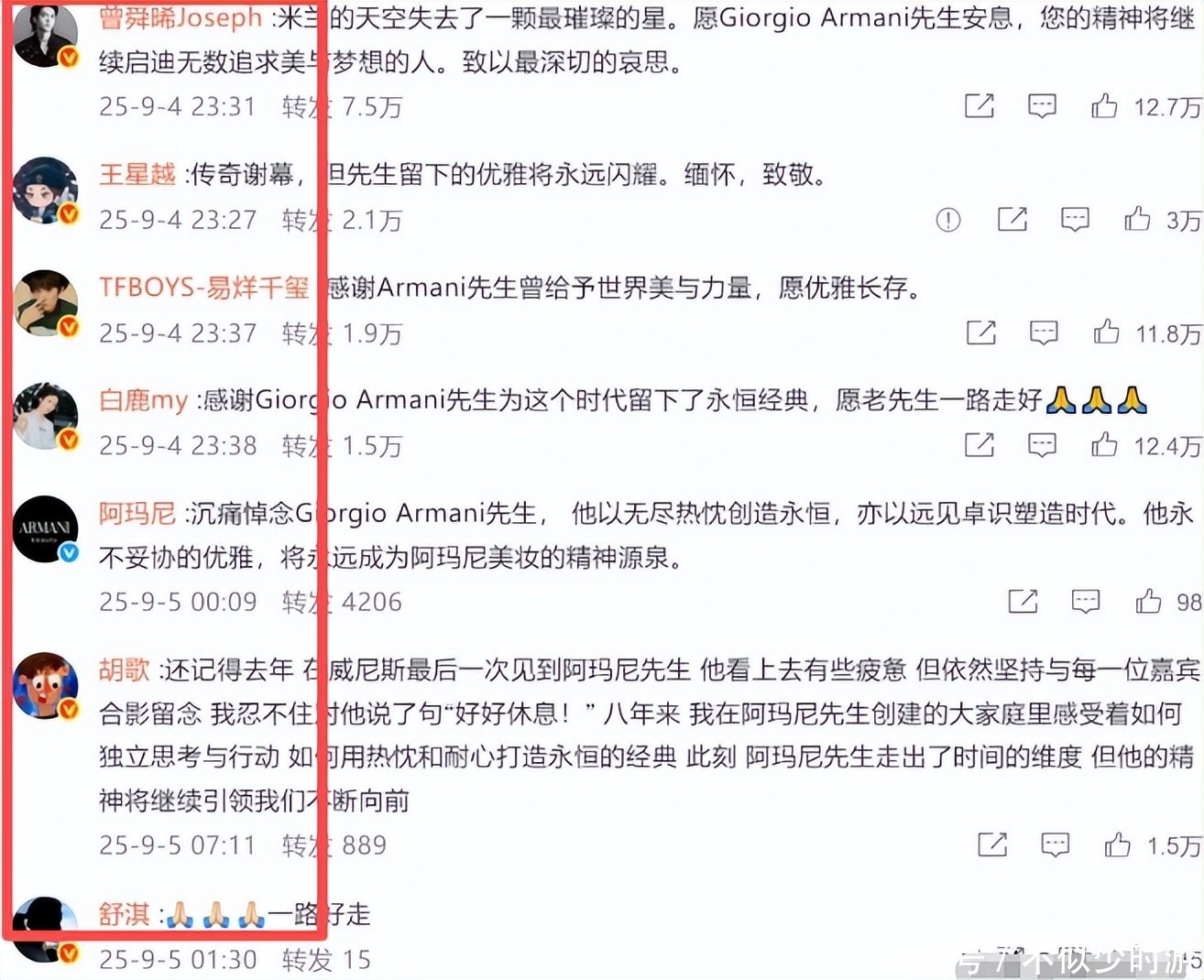 时尚帝国缔造者阿玛尼的离世,引发娱乐圈集体哀恸,众多艺人纷纷在社交平台表达悼念之情。