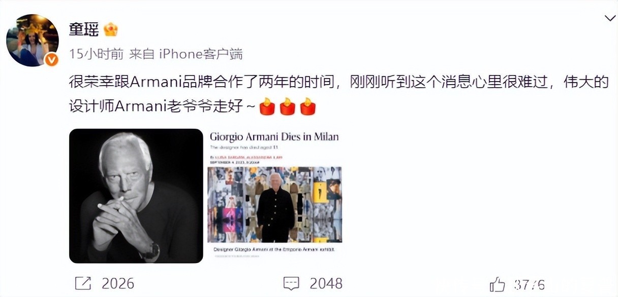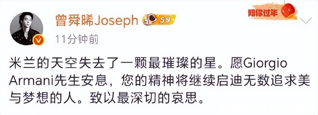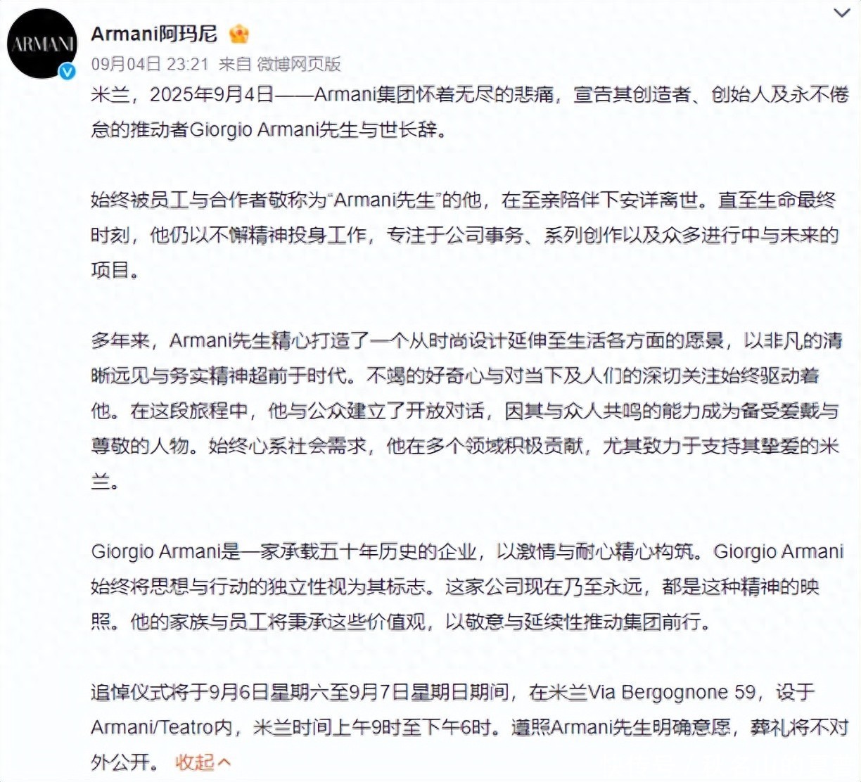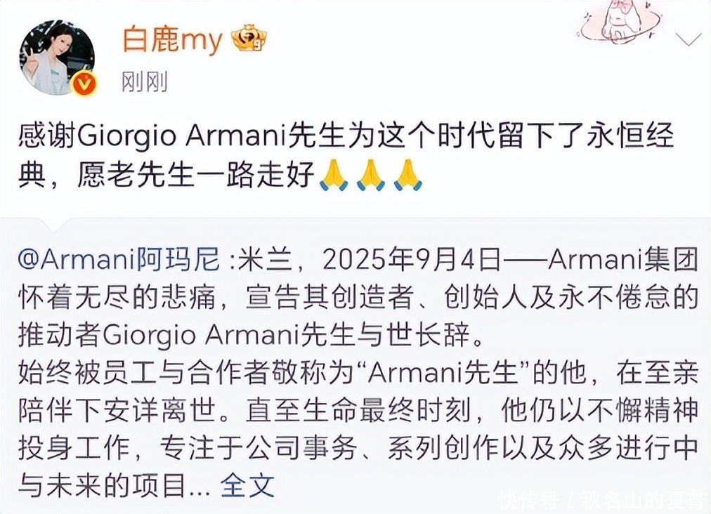 得知阿瑪尼老爺子離世后,內(nèi)娛各明星第一時間發(fā)文悼念。