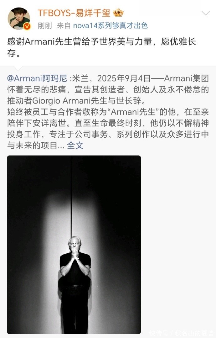 聽聞阿瑪尼離世后,易烊千璽只表達了一句話。