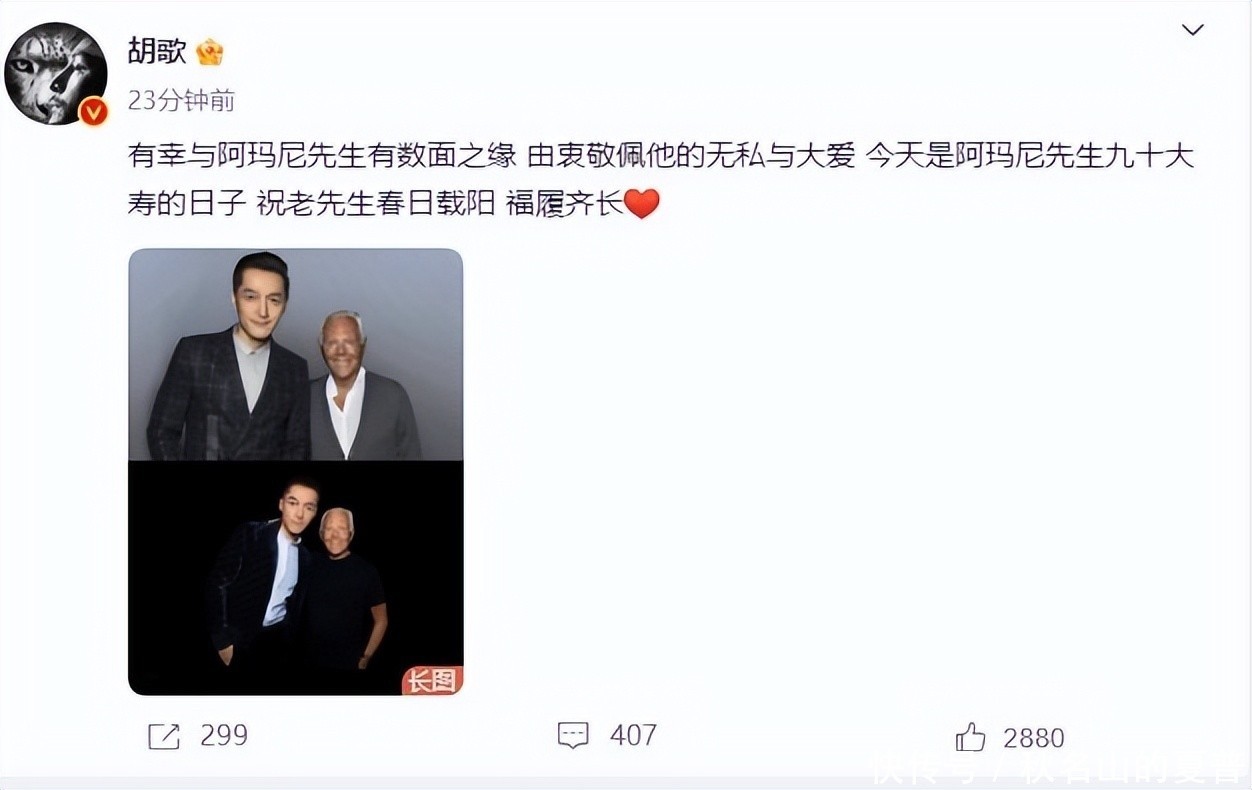而在私下,胡歌與阿瑪尼老爺子的關(guān)系也很要好,去年他還發(fā)文為阿瑪尼老爺子慶祝九十歲大壽的生日,沒想到時間一晃就是一年,當他再次聽到阿瑪尼的消息時,已經(jīng)是訃告了。
