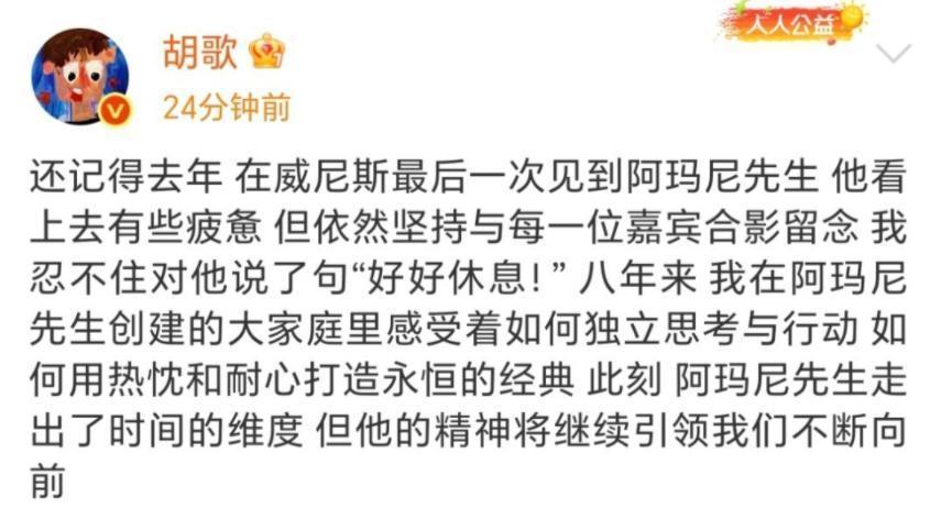 對于阿瑪尼老爺子的離世,胡歌洋洋灑灑上百字,都是他的真情流露。