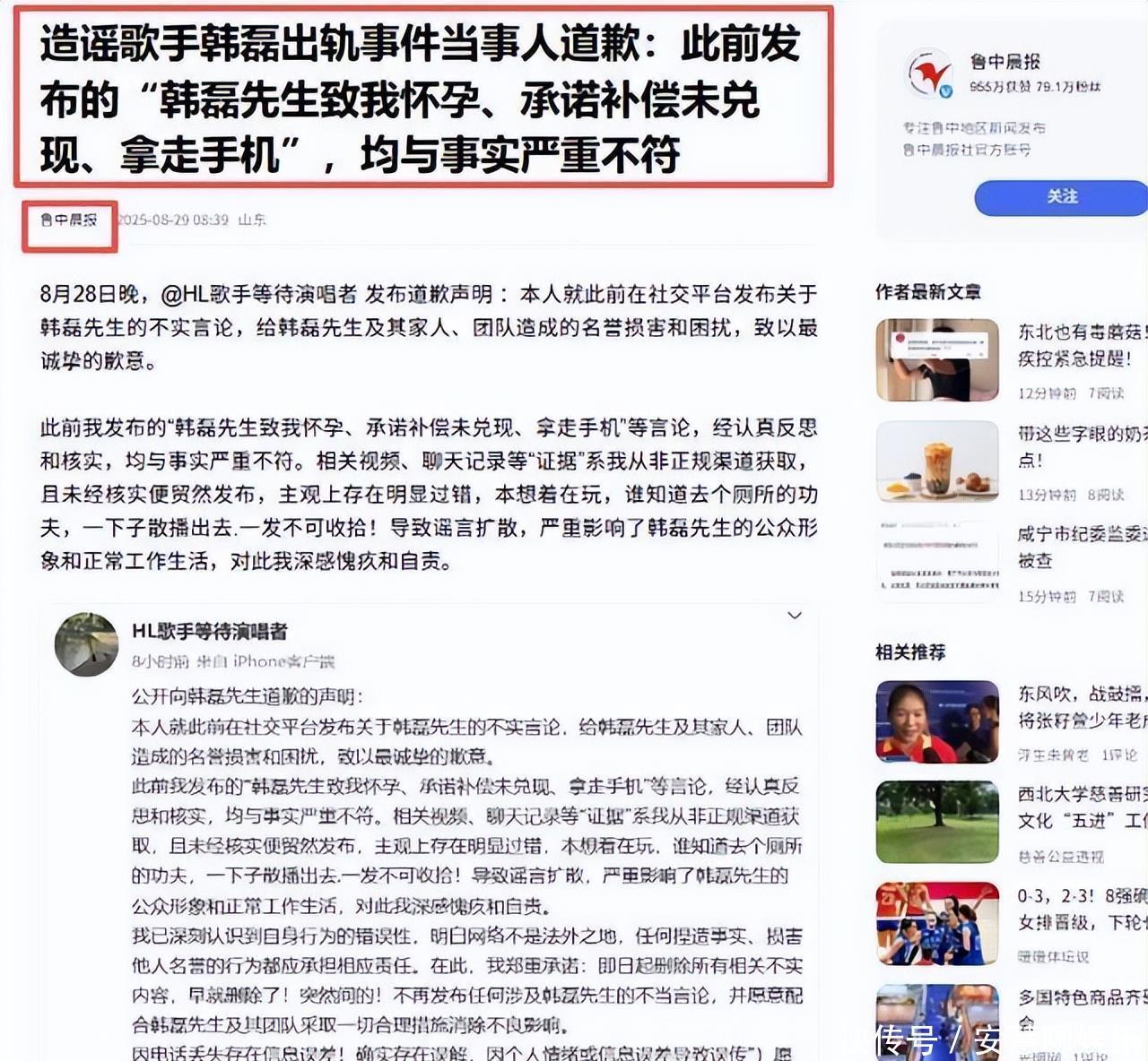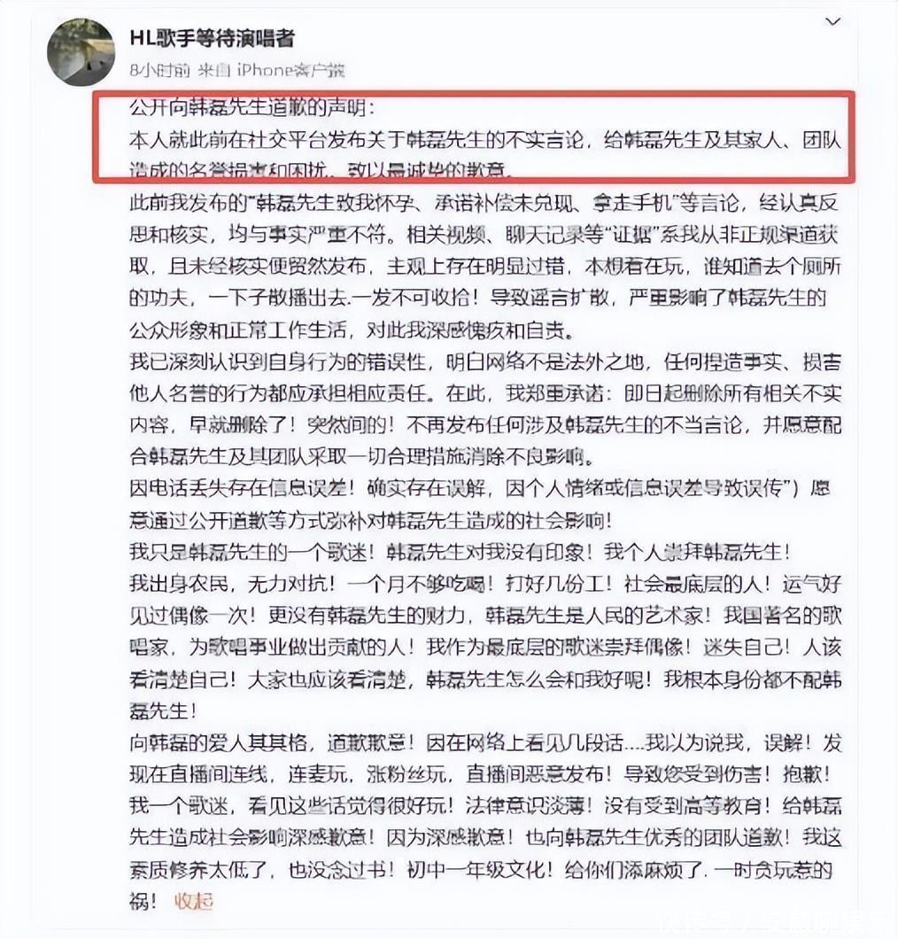 她還說自己只有初中文化,修養(yǎng)不夠,因?yàn)樘矚g韓磊了才瞎編了這些。但韓磊這邊可不接受光道歉就完事。