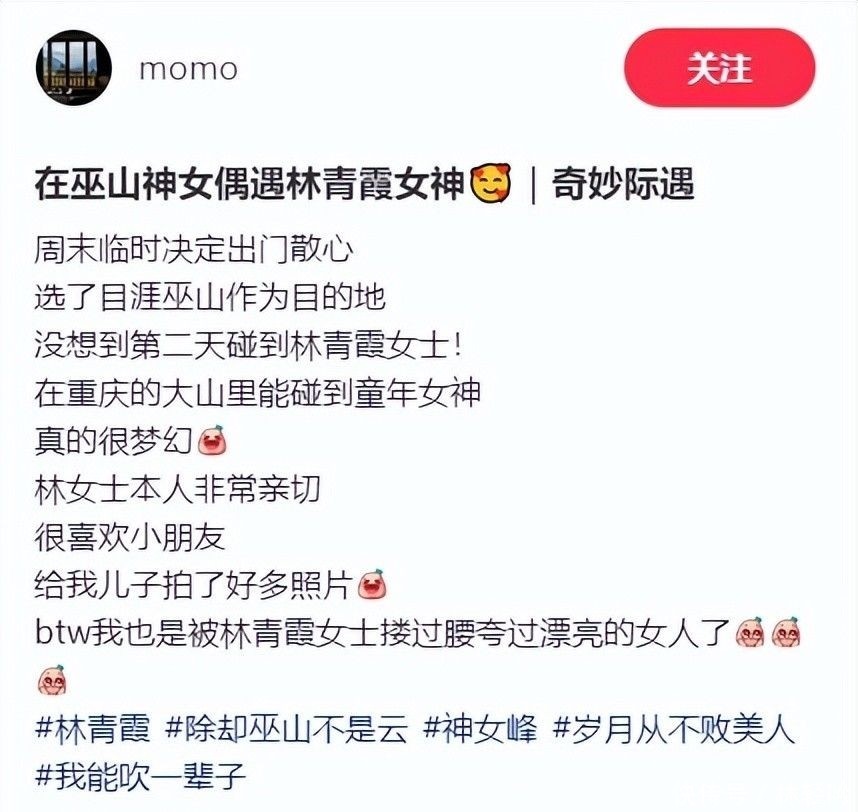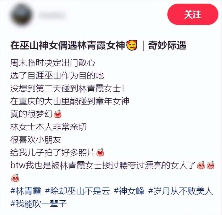 9日,有网友在网络上爆料称,在重庆巫山散心时意外偶遇了林青霞。