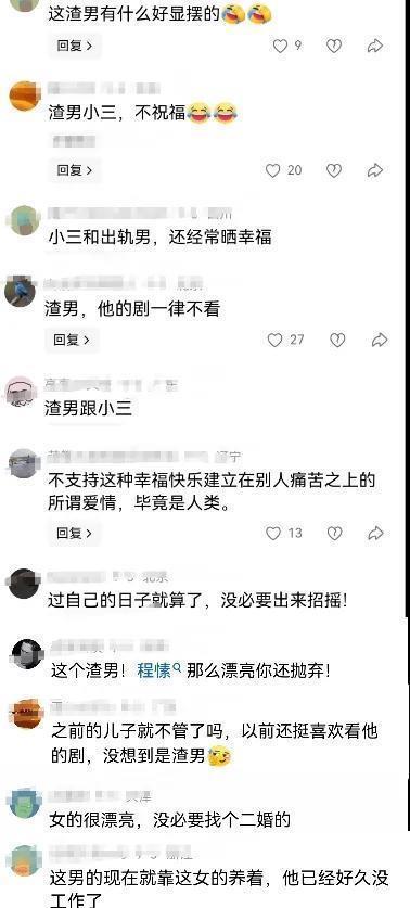 不过话说回来,每次她一笑得灿烂,分享那些日常小确幸,总有一些人心里不是滋味,在评论区吐槽:有人觉得男方靠女方养还晒幸福,还是二婚,之前抛弃了漂亮的程愫,还有的骂他是渣男,女方是小三,认为他俩的幸福建立在别人痛苦上,不支持这种关系,还说等着看他俩遭报应。被吐槽的太多,大家自己看图片吧!