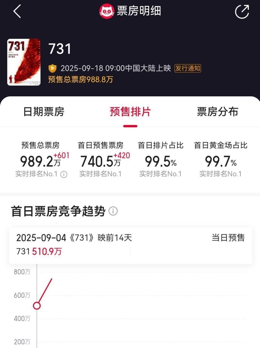 紅星新聞 2025-9-16 《731》預(yù)售總票房破億,首日排映場(chǎng)次突破20萬(wàn)場(chǎng)