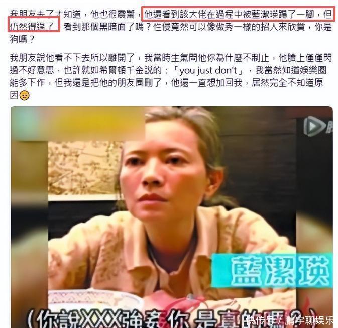 根據(jù)CJ yang所說,她有一個在圈內(nèi)的至交好友,當初在藍潔瑛被大佬欺負時,好友就在現(xiàn)場。根據(jù)好友所說,一開始大佬叫了一些人過去給他撐排場,好友也在其中,不明所以的到了現(xiàn)場,才發(fā)現(xiàn)受害者居然會是藍潔瑛。