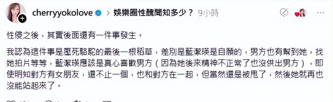 除了這件事之外,CJ yang還聲稱,藍潔瑛后來又愛上了一個男子,對方在圈內(nèi)也有名氣,對藍潔瑛提供了一些幫助。也許藍潔瑛是真的喜歡對方,所以自愿和他相好,只是他卻非?;ㄐ?,談了很多女友,最后還把藍潔瑛給甩了。