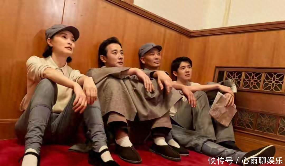 有個細(xì)節(jié)很有意思:羅晉和吳樾都拿著礦泉水瓶,瓶子上的標(biāo)簽都被捏變形了。劉昊然面前放著一張寫滿字的紙,估計是臺詞本,上面還畫著圈圈點點的筆記。他們坐的位置靠近走廊拐角,旁邊就是堆放服裝的架子。
