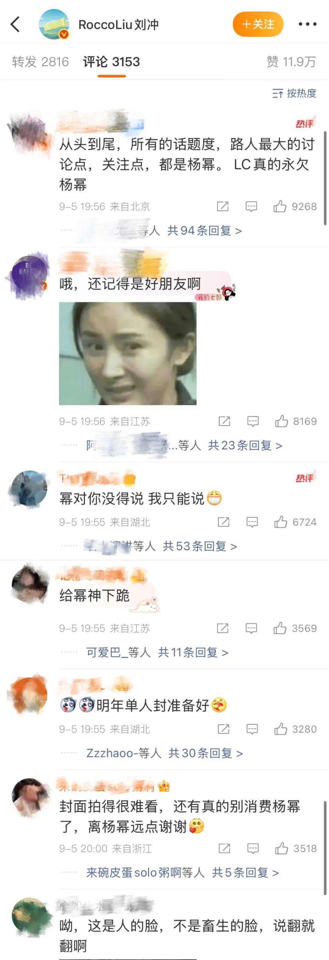 该条微博的评论高+,绝大多数都是杨幂粉丝的吐槽,认为“刘冲背刺杨幂”,口口声声的说和杨幂是好朋友,但却不给她安排好位置。值得注意的是,还有杨幂粉丝“支招”,说明年给她单人封就原谅你。