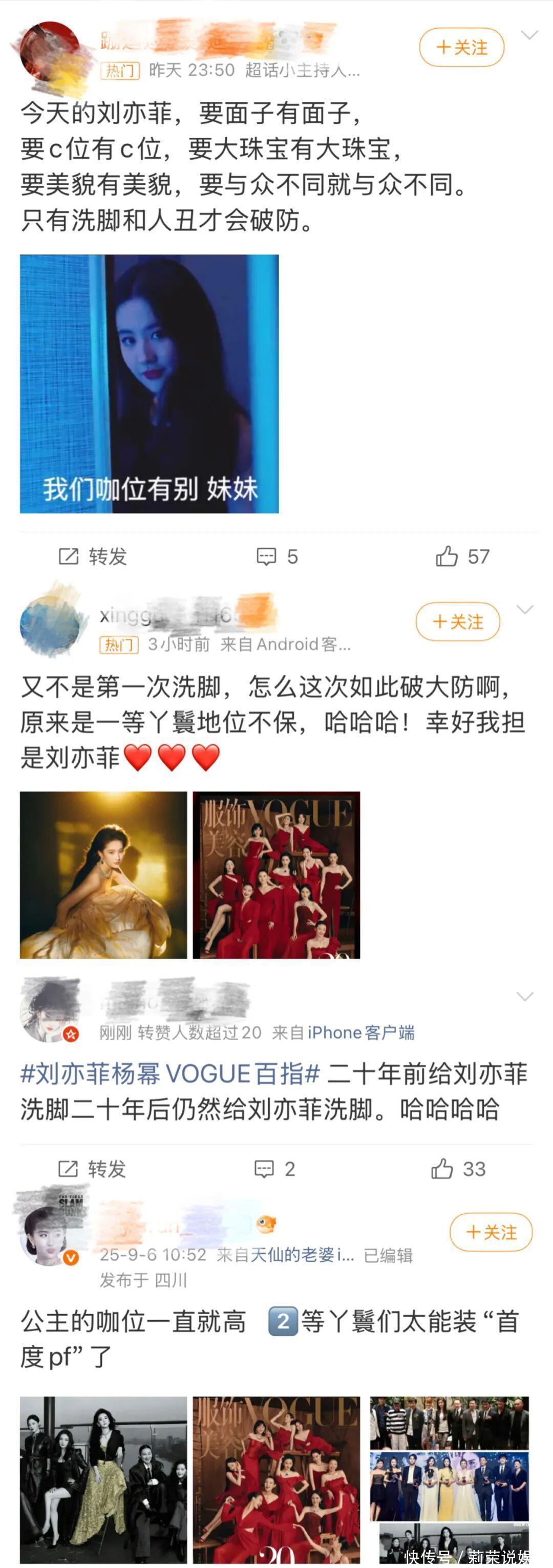 只是吧,部分刘亦菲的粉丝也太“嚣张”了,公然说其他女星是“洗脚婢”“丫鬟”,给人的观感很不好,直接导致不少女明星粉丝下场“开撕”。希望粉丝能过明白一个事实,别人也是来拍摄VOGUE杂志的,而不是为了给刘亦菲做配,至于位置全看“金主爸爸”的心情和主办方的安排。更何况,其他女星的实绩并不比刘亦菲差,有金鸡影后、金马影后、白玉兰视后,华表影后,难道大家都是来给她当“洗脚俾”的吗?