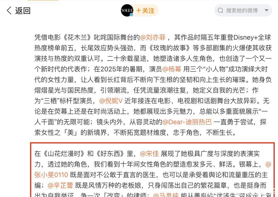 换言之,刘亦菲之前也曾当过二番,也不是次次都站C位,难道她是丫鬟或者洗脚婢吗?说真的,自己姐姐未来还要在内娱混,粉丝低调一点比较好。除了两花的粉丝不对付之外,其他女星的粉丝也在吐槽:明明都是大美女,但在VOGUE的镜头下,人人都成了“没质感的假人”。作为时尚大刊,VOGUE拍出来的效果既不时尚也没质感,有种请了米其林大厨坐镇,结果却做了一碗不咸不淡的泡面上桌。