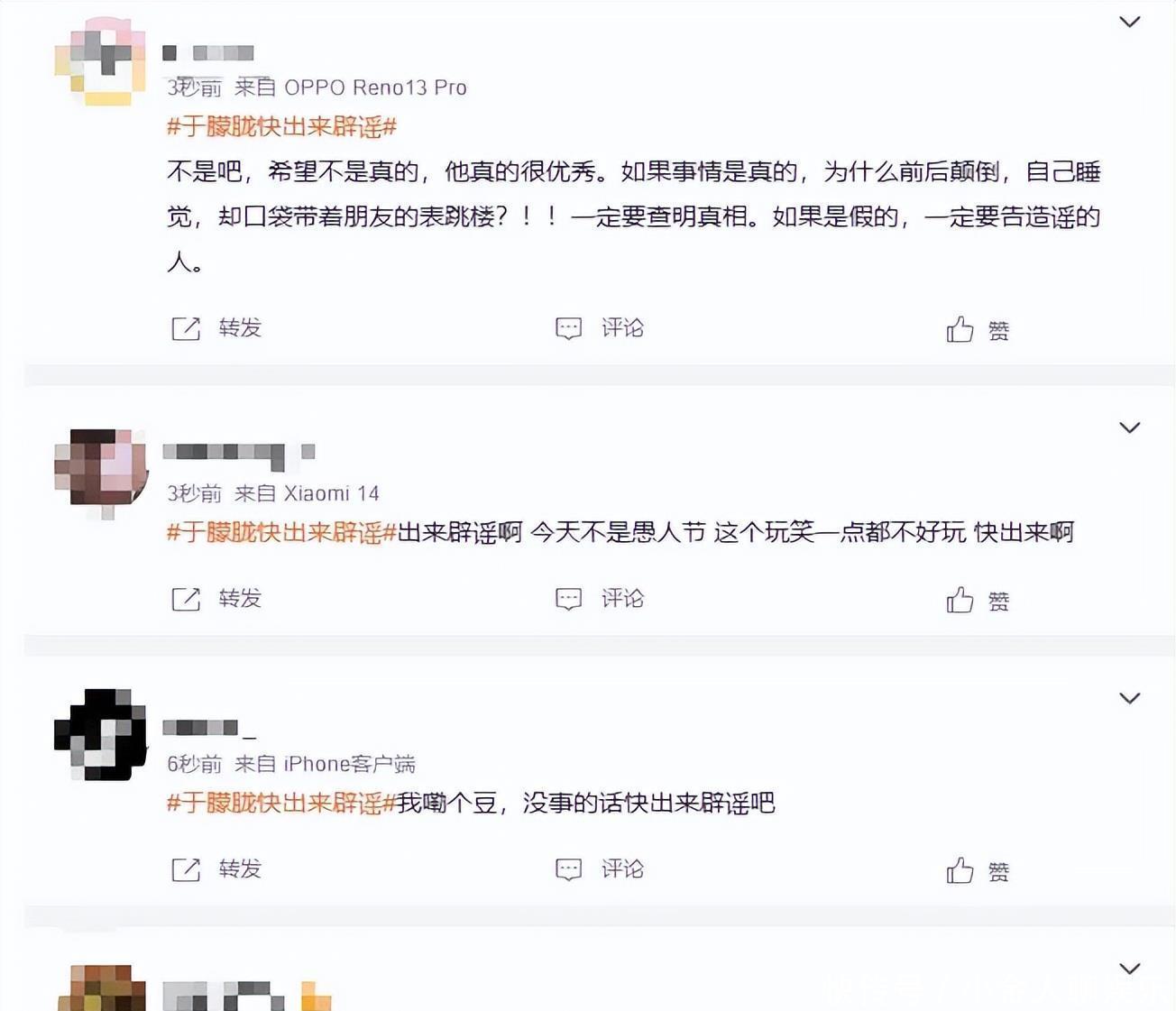 目前于朦胧工作室暂未回复坠楼传言网友纷纷留言喊话本人和工作室“快出来辟谣”。