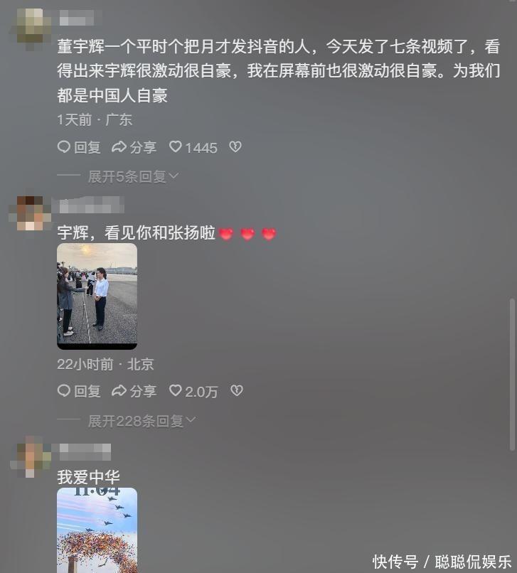 董宇辉作为直播圈的文化人,日的阅兵现场没带货。他这天没开直播,还发了七段现场视频,有三条上了热搜。很多人好奇这人平时教英语卖农产品的,为啥能去现场,还做这些事。他那天发的视频里有红旗方阵、飞机编队,还有全场唱国歌的画面。有视频显示他站在人群里跟着大合唱,声音激动。有粉丝说这是他在北京的唯一熟人,想让他讲讲现场啥样。