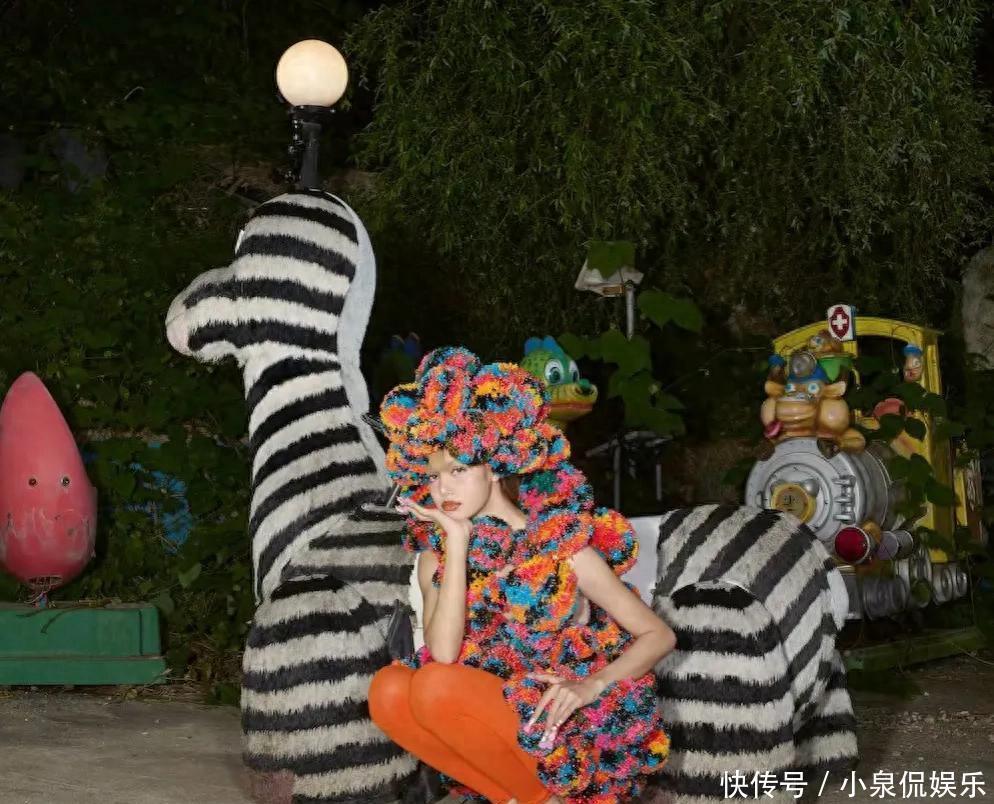 她穿着花里胡哨的像毛线球一样的衣服,穿着橙色丝袜和高跟鞋,在废弃的游乐场拍照。