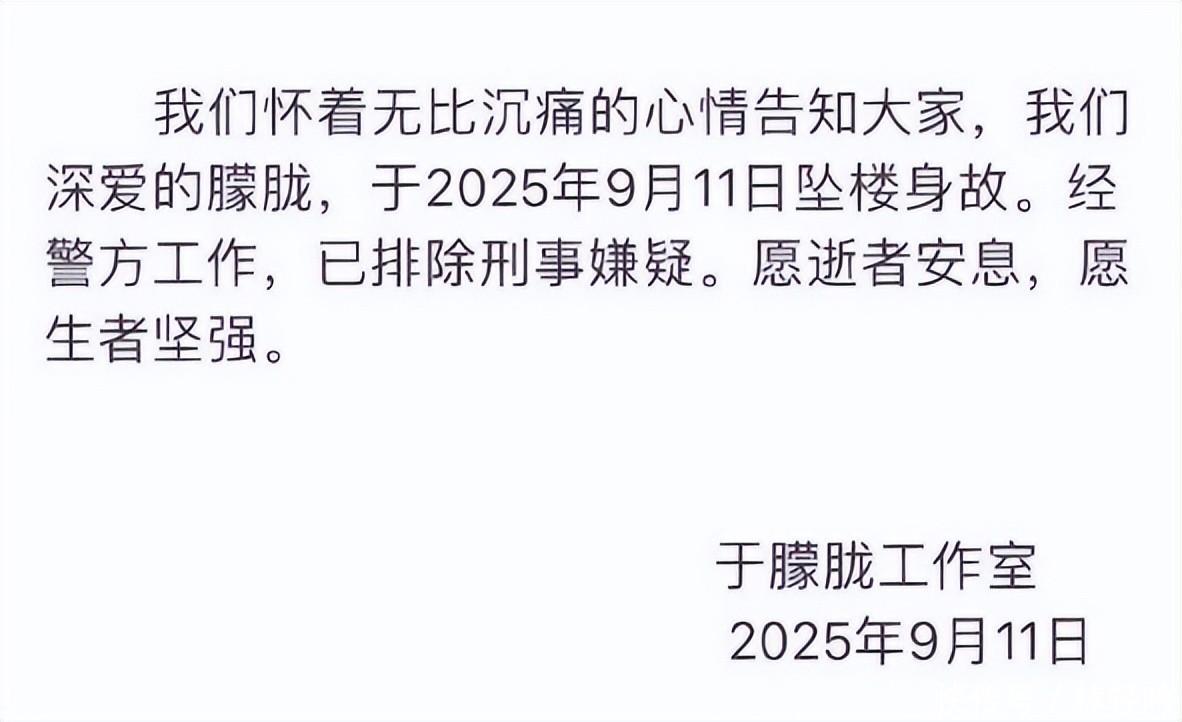 工作室声称,警方调查后已经排除刑事案件,也就是说于朦胧的离开不是轻生就是意外。