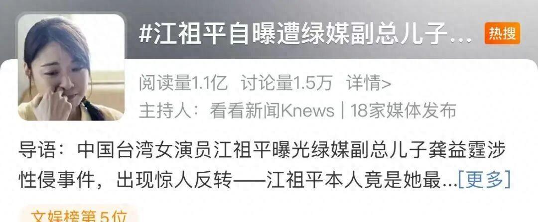 近日,中國臺(tái)灣女星江祖平爆料一涉性侵事件出現(xiàn)驚人反轉(zhuǎn)——江祖平本人竟然就是她最初爆料中所稱的受害女演員。話題迅速?zèng)_上熱搜。