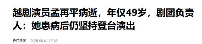 每天3分鐘,點(diǎn)我主頁,解鎖全球科技最新發(fā)展,與社會(huì)時(shí)事內(nèi)幕!這篇文如果您覺得可以,麻煩您動(dòng)小手----收藏點(diǎn)贊關(guān)注----信息來源極目新聞2025-09-01 13:18越劇演員孟再平病逝,年僅49歲,劇團(tuán)負(fù)責(zé)人:她患病后仍堅(jiān)持登臺(tái)演出