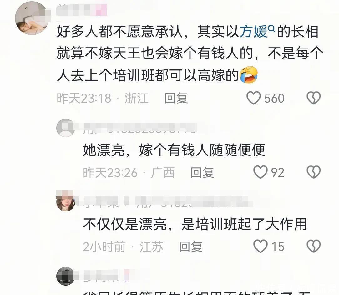 網(wǎng)友們看到方媛逛街的視頻后,她們覺得方媛真的是一個(gè)富貴相,臉部精致,長相也非常美,就算是不嫁給天王也會(huì)嫁一個(gè)有錢人的,不得不說方媛長相和氣質(zhì)都是非常好的,想要像個(gè)有錢人應(yīng)該不難吧。