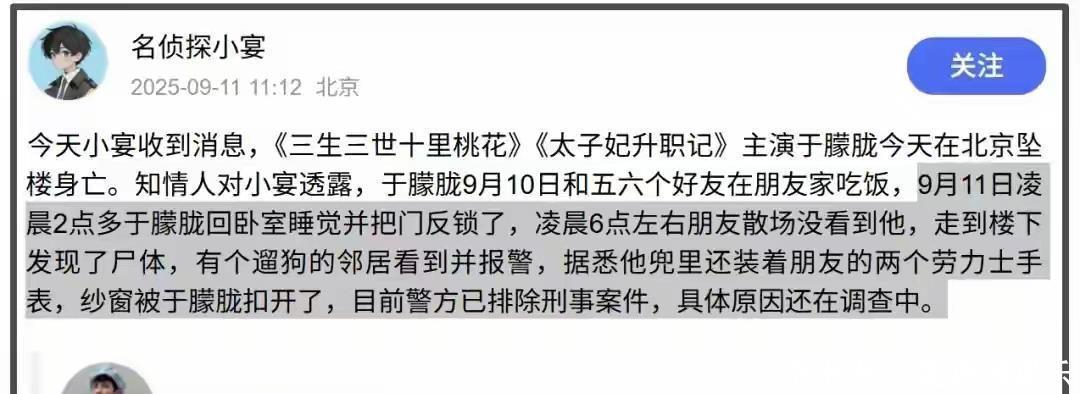 天有不測風(fēng)云,人有旦夕禍福。9月11日,一個(gè)本該普通的日子,卻因?yàn)橐粍t消息讓整個(gè)網(wǎng)絡(luò)炸開了鍋——演員于朦朧,走了。